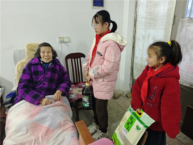 活动当天,在镇妇联工作人员的带领下,小朋友们来到孤寡老人家中。一进门,孩子们就主动向老人问好,随后送上提前准备好的大米和食用油。放下东西后,孩子们围坐在老人身边陪老人聊起了天,认真询问着老人的身体状况和日常起居。小朋友稚嫩又真诚的话语,一句句暖心的问候,让老人倍感温暖,脸上绽放出欣慰的笑容。