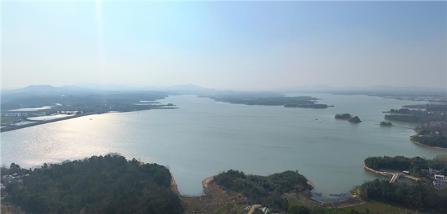 放眼望去,700多公顷湖面波光粼粼,在晴日下泛着细碎金光,星罗棋布的岛屿点缀其间,与远处黛色山峦相映成趣。湖畔田畴铺展,金黄的油菜花与嫩绿的秧田交织成锦,粉墙黛瓦的民居错落有致,勾勒出江南水乡的温婉肌理。微风过处,草木抽芽的清新气息与湖水的温润水汽交融,让人心旷神怡。