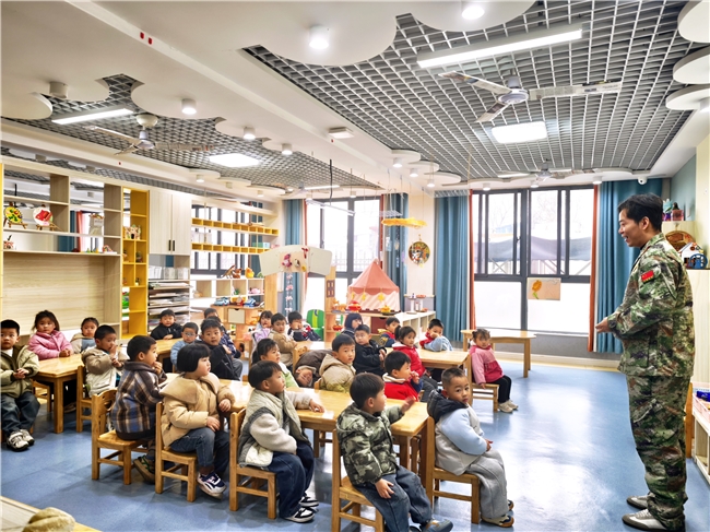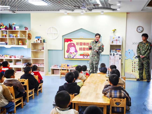 活动伊始,幼儿园活动室里座无虚席,孩子们端坐整齐,眼神中满是期待。辖区退役军人张海同志与张凌翔同志身着整洁服装,身姿挺拔、精神矍铄,以“雷锋叔叔的故事”为主题,为孩子们带来一堂生动的红色思政课。老兵没有空洞的说教,而是结合幼儿认知特点,用通俗易懂的语言、鲜活生动的事例,讲述雷锋同志勤俭节约、助人为乐、爱岗敬业的感人事迹:从雷锋冒雨护送老人回家、帮战友缝补衣物,到“出差一千里,好事做了一火车”的点滴善举,再到雷锋日记中“把有限的生命投入到无限的为人民服务之中去”的崇高追求。两位老兵还结合自身军旅生涯,分享自己在部队践行雷锋精神、坚守初心使命的经历,用真实故事打动在场每一个人。孩子们听得全神贯注,不时举手提问,“雷锋叔叔为什么总爱帮助别人”“我们怎样才能像雷锋叔叔一样”, 稚嫩的话语饱含对榜样的崇敬,现场氛围温暖而庄重。